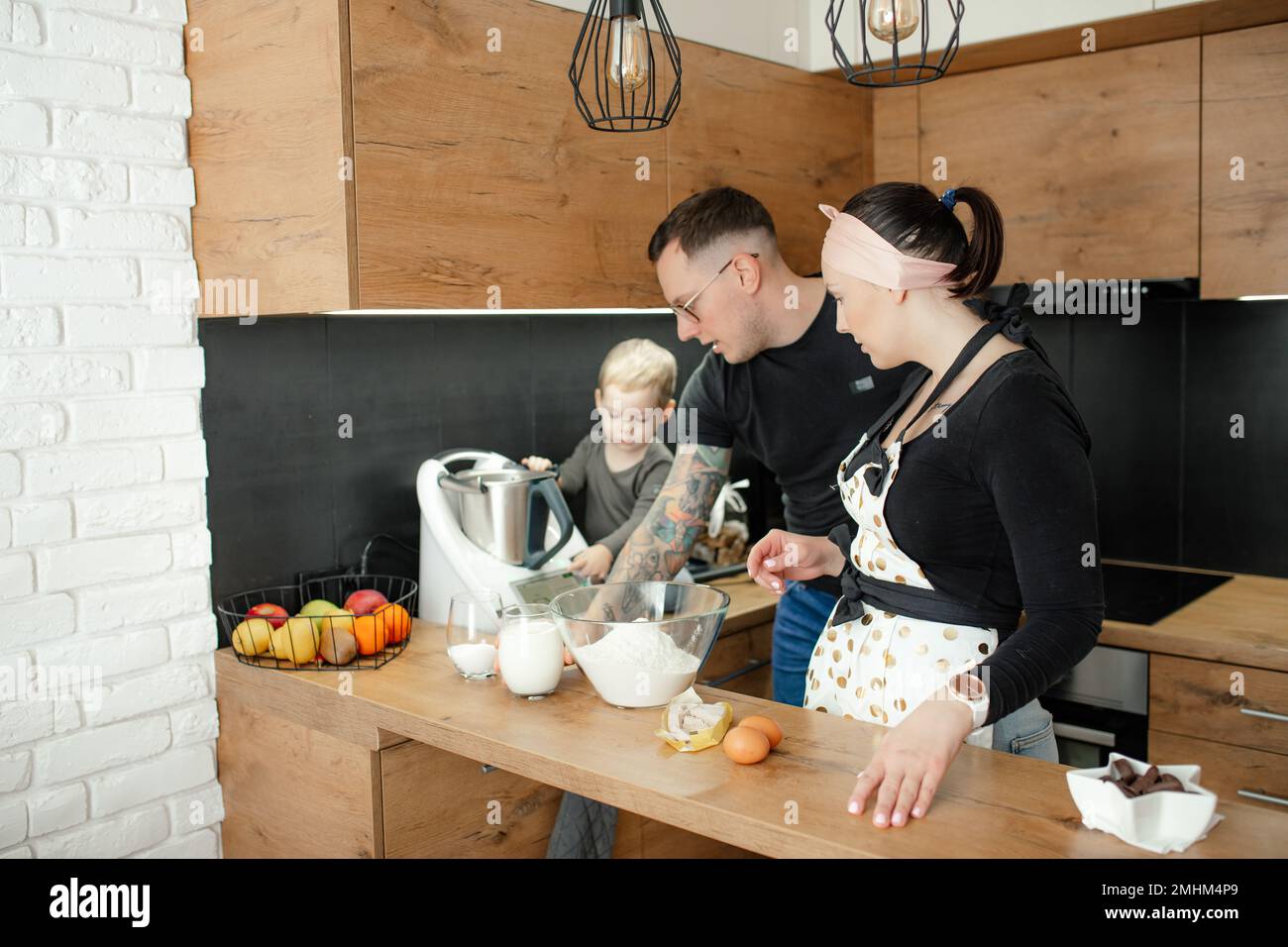 Family From Three People Together Cook Dinner In Kitchen, Side View